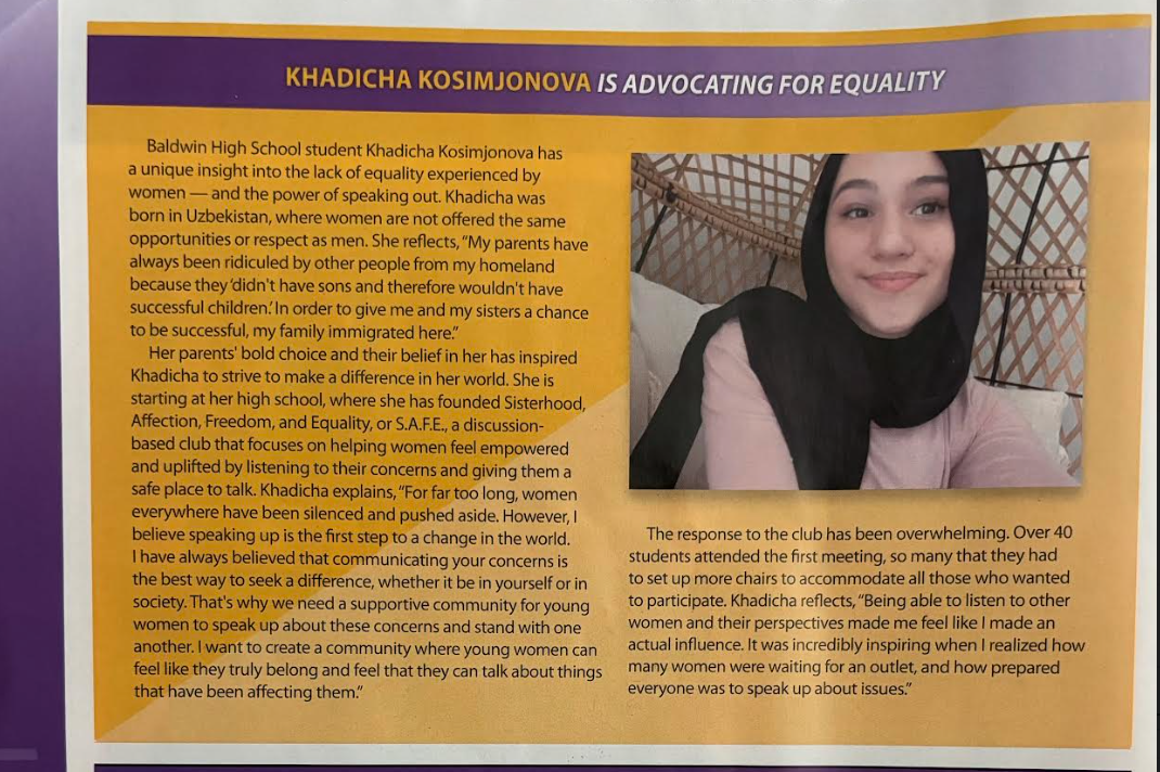 Khadicha Kosimjonova is a junior at Baldwin High School and started working on creating the club at the end of her freshman year. When she was just a few months old, her parents immigrated to America from a developing country with patriarchal double standards in education and careers. This has affected her perspective and has always left her wanting to help women attain fair chances at education and careers. Because of the misogynistic undertones of this country, she has always preached women’s equality and freedom.